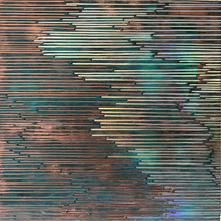 Sylvia Hommert, " Rose Gold Passages" ( Oxidized ), encaustic, metallic dust, and paints on wood, 42x42", $10,000