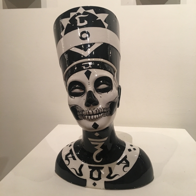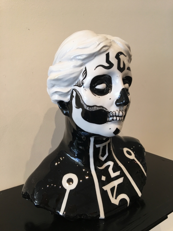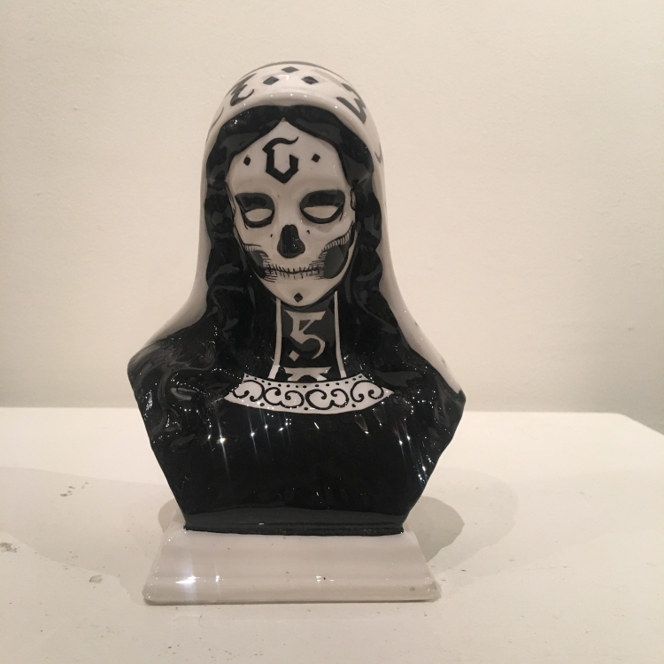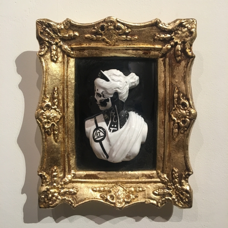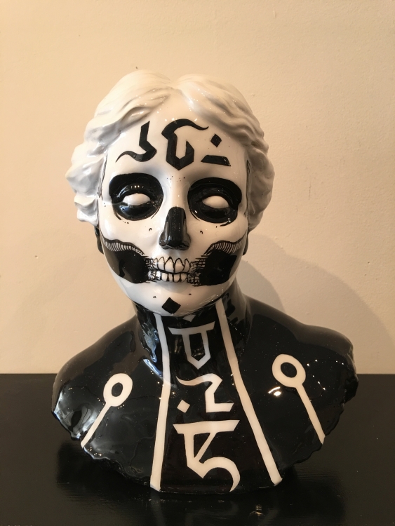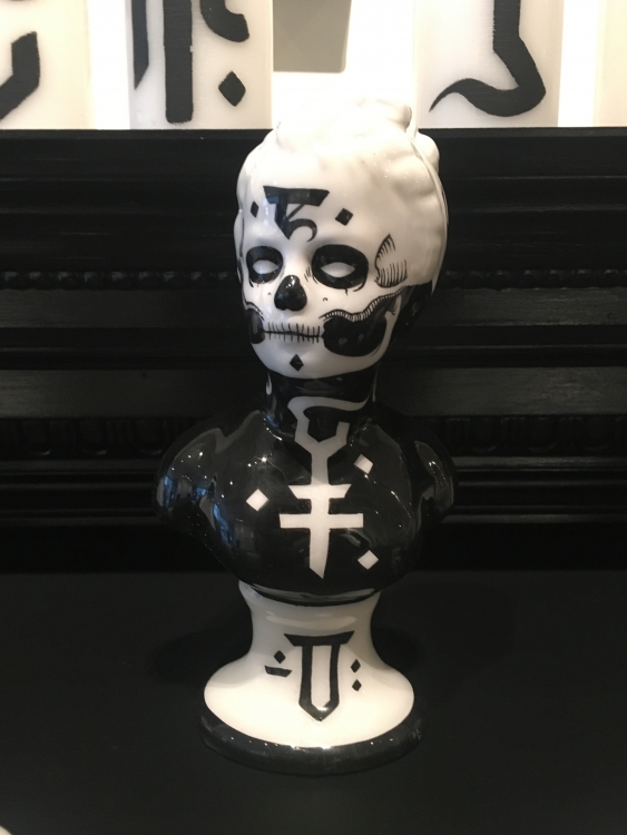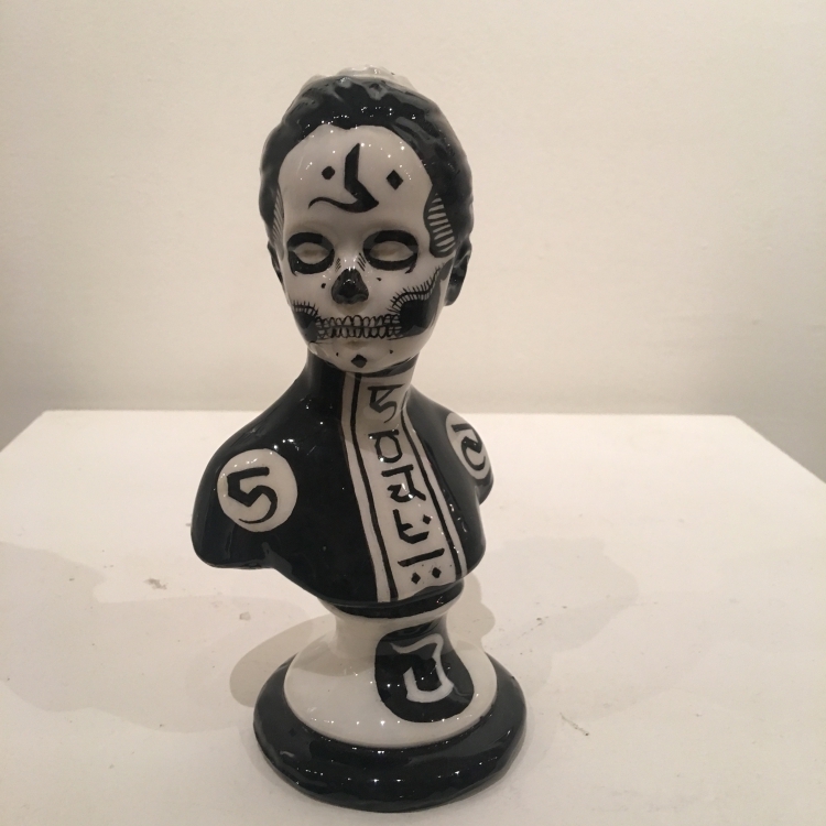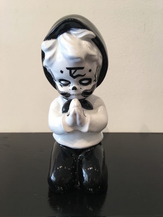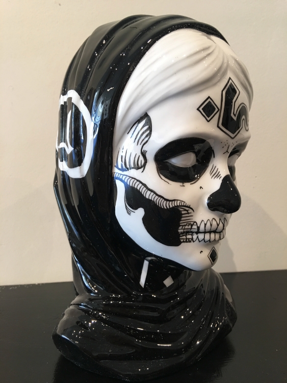 Influenced by ancient block printing techniques, history and literature, the artist Porkchop sources out, manipulates, and casts familiar objects. He then painstakingly recreates their surfaces giving them a new existence into a dark and curious storyline. The application of paint into his intentional ritualistic designs followed by flawless coats of glossy resin is an act of pure precision and care, like the work of a surgeon or mortician. There are often unexpected but pleasant marriages of imagery and object. By stripping these pieces of his usual vibrant palette, Porkchop’s choice of black & white emphasizes the narrative in the works, which becomes difficult to ignore.