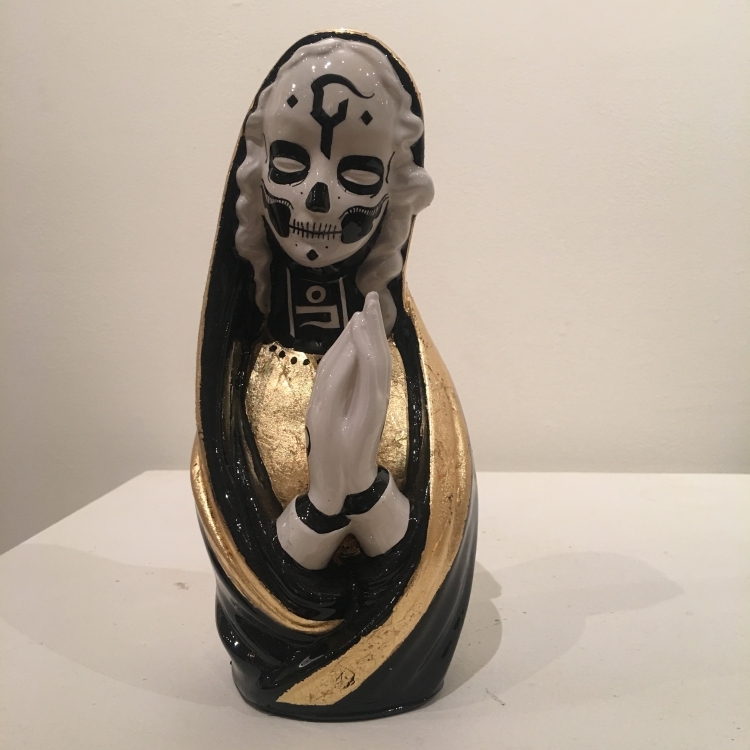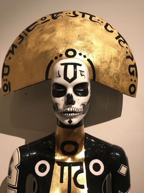 In Achromatic, the artist will be presenting new works from his ongoing body or work called “Elucidation” which is a mixed media installation that depicts a figurative realization and narrative of an imagined post apocalyptic religion called “Leviism”: giving the viewer a past, present and future view. Its deities, icons and prayer stations are relics from a distant past and a multi dimensional realm, which has its origins in ancient times. Those who channel themselves through outer body planes to connect to a polytheistic divinity, follow this esoteric religion. Only after a catastrophic event does it make it realized in this dimension. With new awareness and perception of energy fields, this new religious sect awakens and is able to make contact with the non-physical world