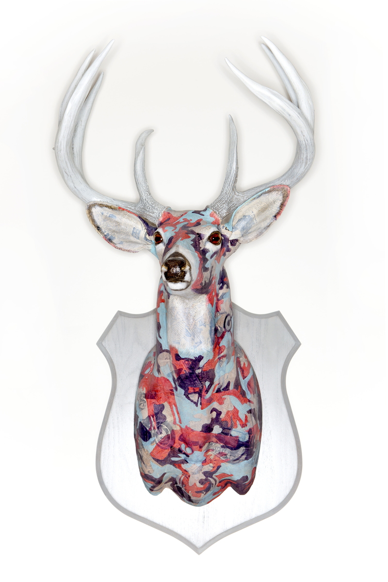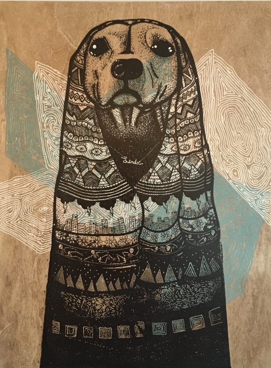 Lisa Brawn ~ “I have been experimenting with primarily figurative, portrait genre painted woodcut blocks for over twenty years since being introduced to the medium by printmakers at the Alberta College of Art and Design. For the past five years I have been particularly interested in wildlife and especially wild birds. The most recent development in this series is the use of damask and geometric pattern wallpaper backgrounds. These patterns flatten the picture plane and create a visual intersection between the chaotic beauty of nature and the controlled beauty of design. Almost exclusively, I use reclaimed and salvaged wood, primarily Douglas Fir beams from the restoration of the century-old Alberta Block in downtown Calgary. This wood is interesting not only in its history, but also in that it is very rustic, with knots, nail holes, and gouges. I don’t make prints from the woodcuts, but prefer the tactile quality of the blocks themselves.