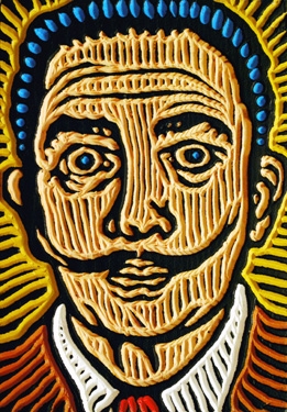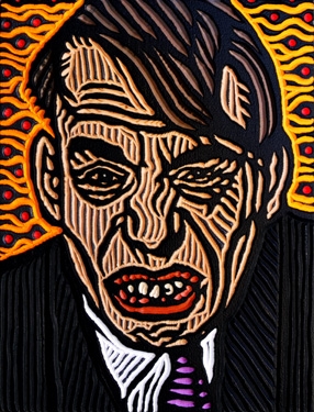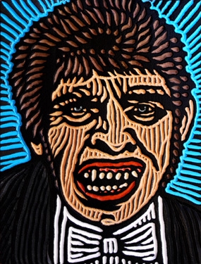 There are several ongoing portrait series that I work on, such as Quién es más macho? referencing popular culture personas and archetypes from 1920s silent film cowboys to 1970s tough guys. Other series include “Canadiana”, Sideshow, Telephone Company Transfers and Promotions, Take Me to Your Leader, and Honky Tonkin’ Honey, Baby. I also work on an ongoing series of glossy enamel icons and text-based Pop woodcuts, and in 2013 I installed a series of these on the exterior of private residences in inner city Calgary, in a pay-it-forward public art project called Pophouse.” – L. Brawn