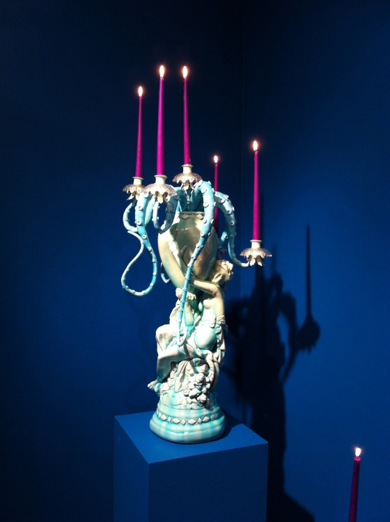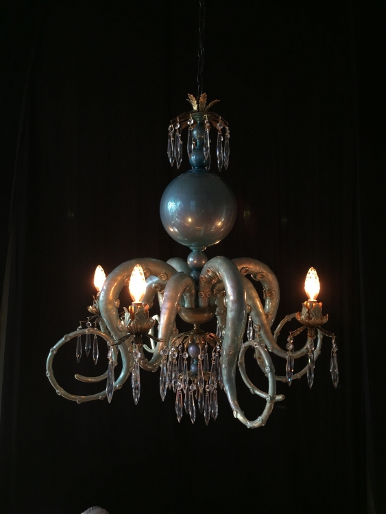 Inspired by an obsession with the ocean and a fascination with extravagant interiors of old churches, Adam Wallacavage transformed the dining room of his South Philadelphia Victorian Brownstone into something from the pages of a Jules Verne novel. Teaching himself the ancient art of ornamental plastering, Adam evolved his new found skills into making plaster cast octopus shaped chandeliers as the final touch to his underwater themed room. Not content with leaving the chandeliers to his own home, Adam continued his experimentation by making more and more. He changed the shapes and colors and even collaborated with famed jewelry designer, Tarina Tarantino, who supplied the beautiful pearls for his pink glitter chandelier featured in his first showing at Jonathan LeVine Gallery in June of 2006. The same chandelier will be included in the Juxtapoz retrospective show at the Laguna Art Museum in June of 2008, before arriving at its permanent home, in the entrance of Tarina’s new Sparkle Factory, in downtown LA. Beyond making chandeliers, Adam Wallacavage is also an accomplished photographer, documenting artists, musicians, daredevils and all things weird and wonderful. His first book,