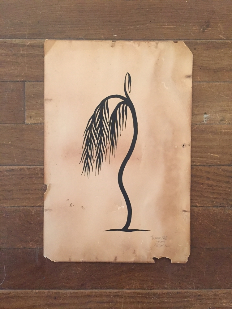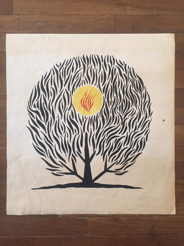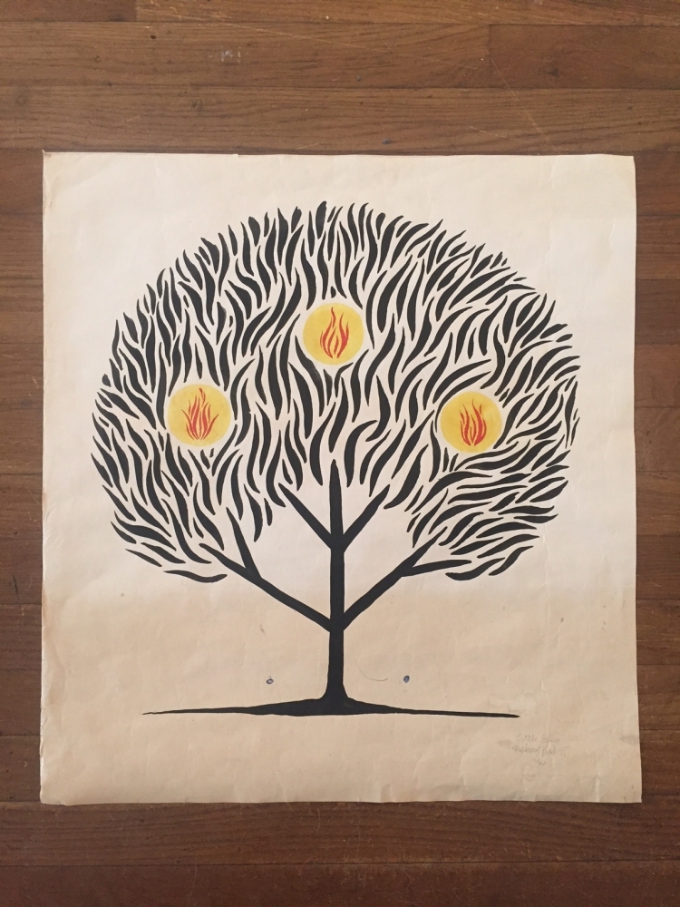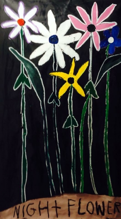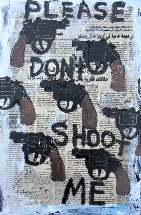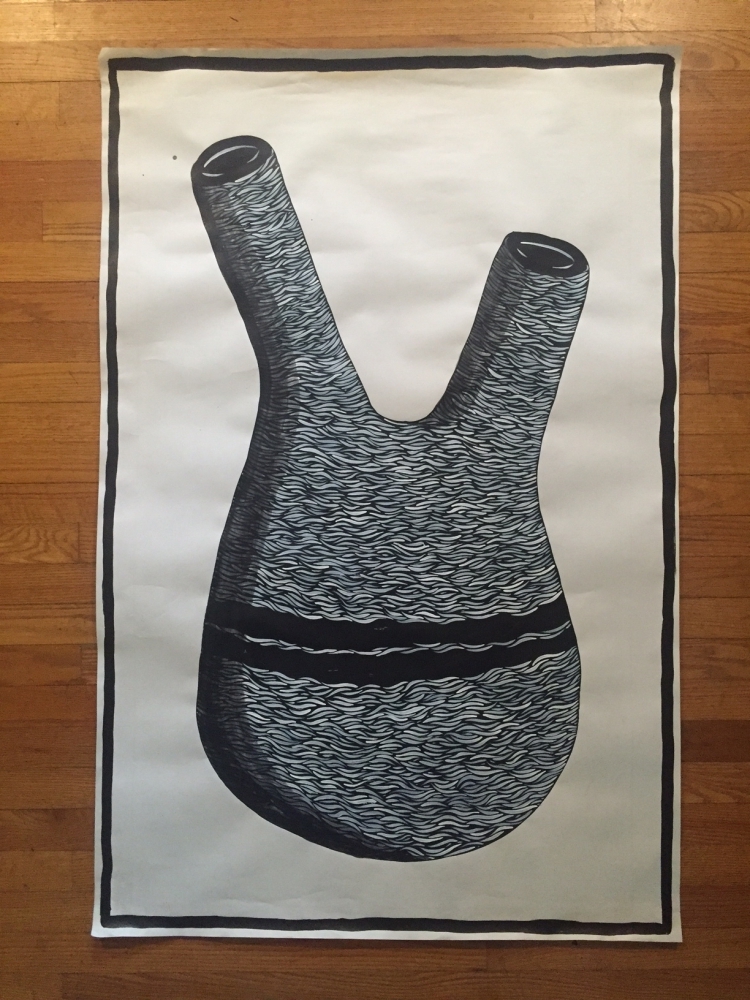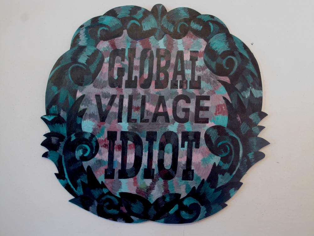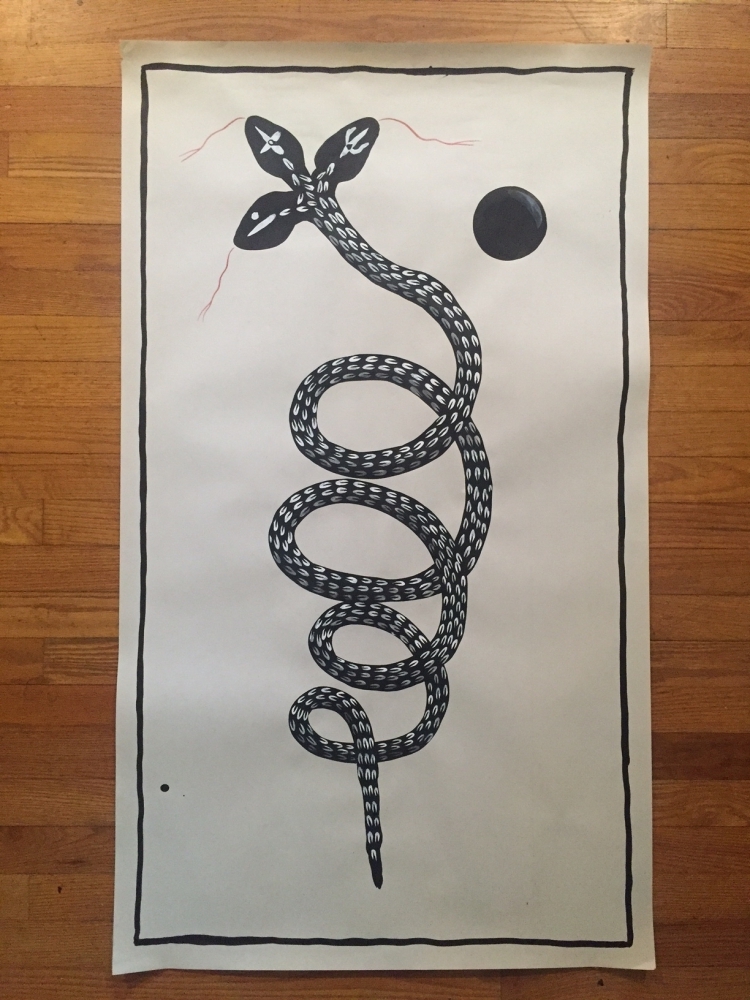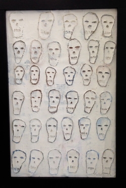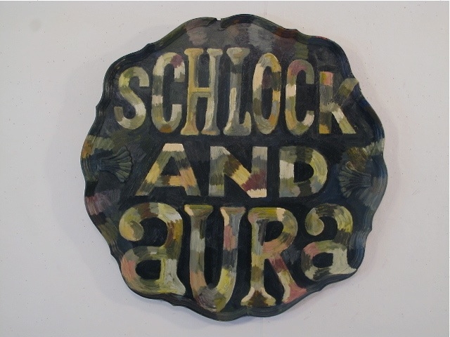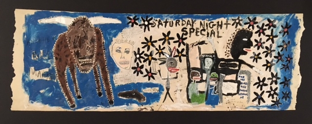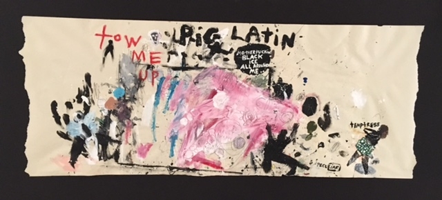 “About 3 years ago,  I was in Chinatown in Manhattan during the summer when a Chinese street minstrel pointed at me and my tattoos and said “Art. You are art.” I gave him a buck, turned around and went into the now defunct Pearl Paint and bought supplies. I had been wanting original artwork for my home, but couldn’t afford anything I liked. So I became obsessed by Basquiat and Gerard Richter and here I am, now a resident of the Jersey shore, chef of Pascal and Sabine, and a humbled member of this show. As a matter of fact, I still have recording of that guy playing his harp. I play it periodically as I am painting. That’s a true story.”~ R. Santello