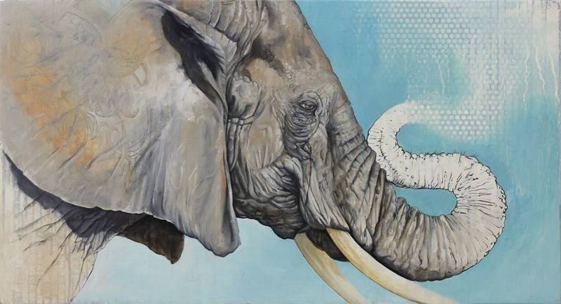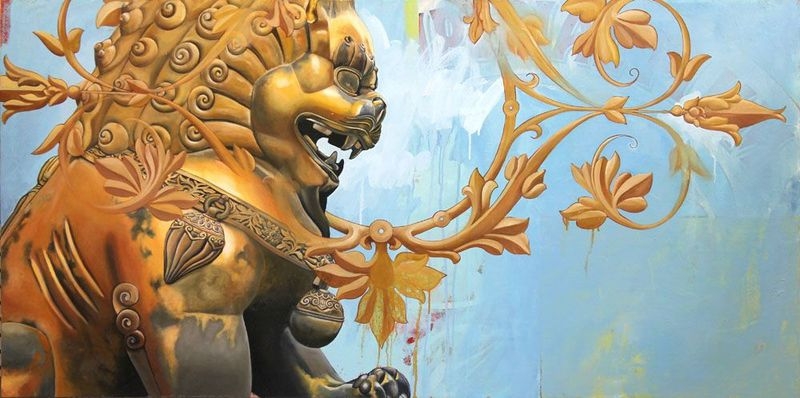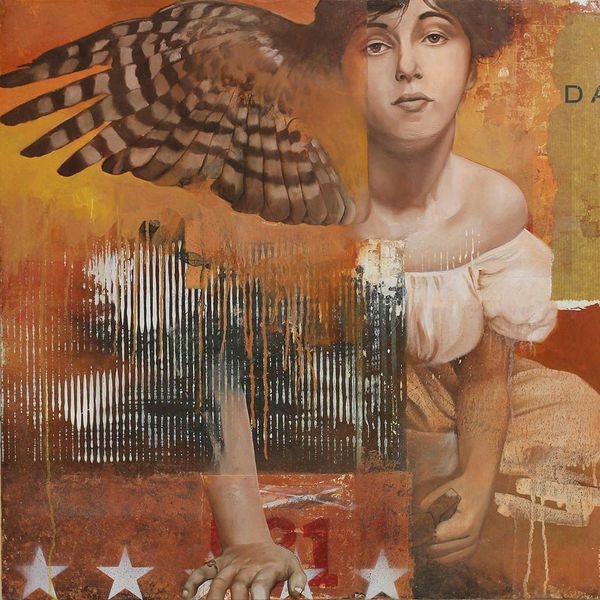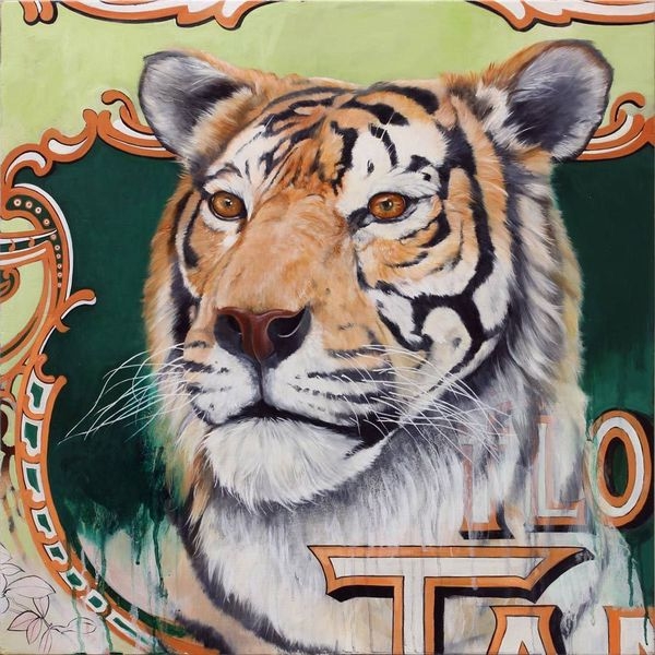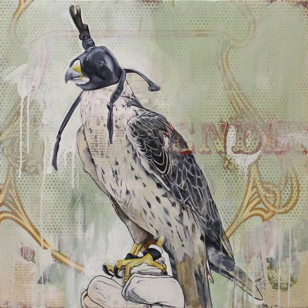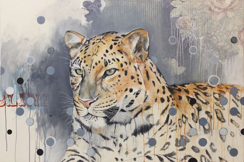 ‘s work is primarily painting, with a mix of collage, found art, image transfer techniques, and a variety of other experimentation. His work often incorporates text, patterns, decorative motifs, etc., that when contrasted with animals or people, serves to create a tension both visually and thematically.