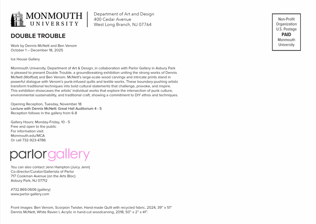 Parlor Gallery in Asbury Park is proud to collaborate with Monmouth University’s Department of Art & Design to present DOUBLE TROUBLE, a major exhibition featuring Dennis McNett (Wolfbat) and Ben Venom.